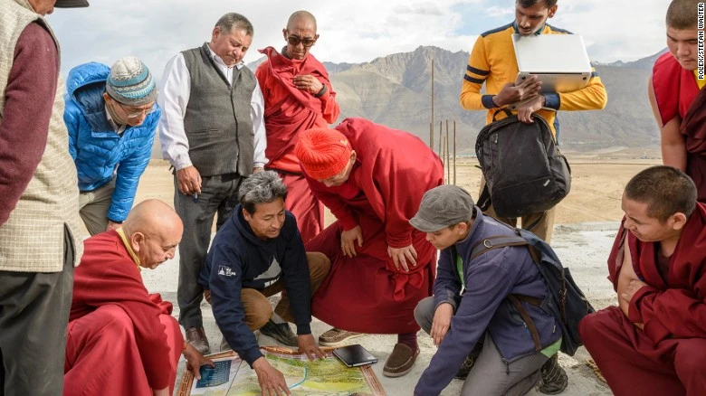 Wangchuk đang cùng các tu sĩ và đồng nghiệp thảo luận về mô hình tháp băng. Ảnh: CNN