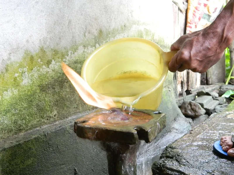Theo quan sát của chúng tôi, chỉ cần một mồi lửa, từ miệng giếng khoan này sẽ phụt lên ngọn lửa màu xanh, cao khoảng 3 cm, không có mùi. Điều kỳ lạ hơn là càng đổ nước vào miệng giếng thì ngọn lửa càng bốc cao hơn và không tắt.