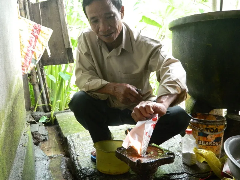 "Trong lúc đó chỉ cần dùng máy lửa bật ở miệng giếng thì sẽ phụt lên ngọn lửa. Lo lắng vì dòng khí lạ dưới chiếc giếng khoan, tôi đã mua cát đổ xuống miệng giếng hòng chặn dòng khí này, nhưng bất thành", ông Hiến cho biết.