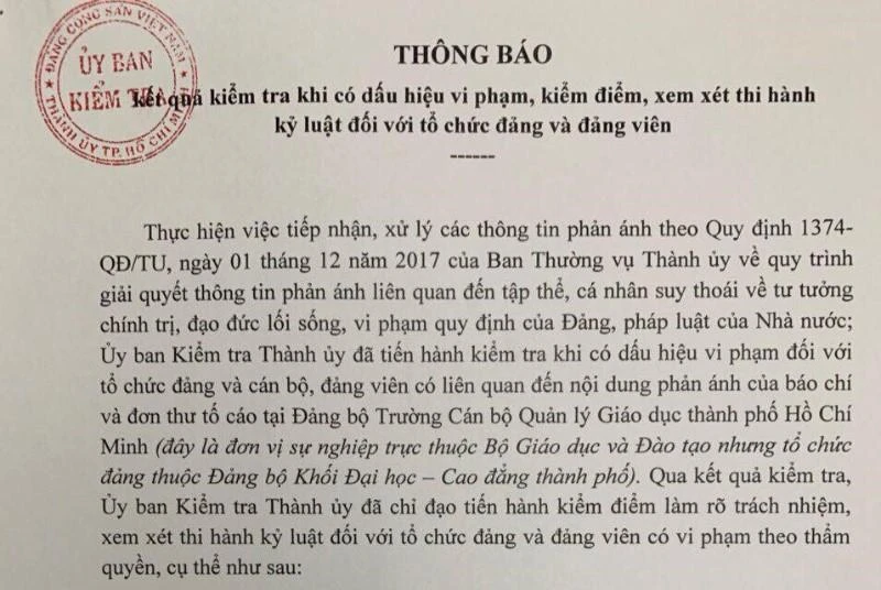 Theo Ủy ban Kiểm tra Thành ủy, thực hiện việc tiếp nhận, xử lý các thông tin phản ánh theo Quy định 1374, Ủy ban Kiểm tra Thành ủy đã tiến hành kiểm tra khi có dấu hiệu vi phạm đối với tổ chức đảng và cán bộ, đảng viên có liên quan đến nội dung phản ánh của báo chí và đơn thư tố cáo tại Đảng bộ Trường Cán bộ quản lý Giáo dục TP.HCM.