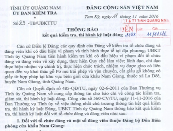 Chiều 11-11, Ủy ban Kiểm tra (UBKT) Tỉnh ủy Quảng Nam đã ra thông báo số 83 về kết quả kiểm tra, thi hành kỷ luật đảng liên quan đến vụ việc khai thác gỗ Pơ Mu trái phép và vận chuyển, cất giấu gỗ không có giấy tờ hợp pháp tại khu vực biên giới cửa khẩu Nam Giang (thuộc xã La Dêê, huyện Nam Giang).