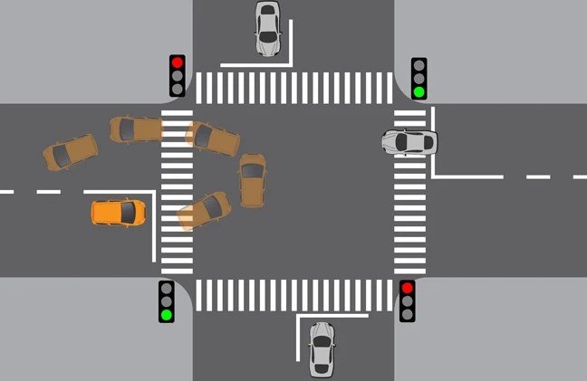 Quay xe tại giao lộ: Trước khi tới giao lộ, bạn cần đi thật chậm để có thể quan sát trước tình hình xe cộ đang lưu thông, lái xe áp sát làn ngoài cùng bên trái, quan sát kĩ gương chiếu hậu, bật đèn xin rẽ trái trước khoảng 15m và đi chậm dần để các xe đi sau không bị dồn toa bất ngờ. Dừng xe khi vị trí lái của bạn đã qua hết đoạn có dải phân cách, bẻ hết lái rồi sau đó mới rẽ.