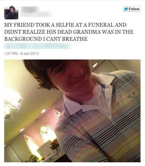 3: Tự sướng trong đám ma – Ảnh trích trong một bài đăng trên trang mạng xã hội có nội dung “Bạn tôi chụp ảnh tự sướng trong một đám ma mà không hề nhận ra rằng xác bà cậu ta ở phía sau của bức ảnh. Tôi không thể thở được”.