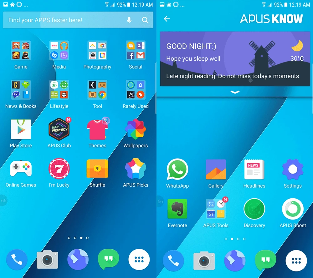 Apus Launcher có cửa sổ tìm kiếm tương tự như các phiên bản iOS cũ, tự động phân loại phần mềm dựa trên cách sử dụng. Ngoài ra, ứng dụng còn tích hợp sẵn công cụ tăng tốc hệ thống bằng cách xóa bộ nhớ cache, làm mới bộ nhớ RAM… đồng thời hỗ trợ người dùng gỡ bỏ bloatware (các ứng dụng được nhà sản xuất cài đặt sẵn trên thiết bị) nếu cảm thấy không cần thiết.