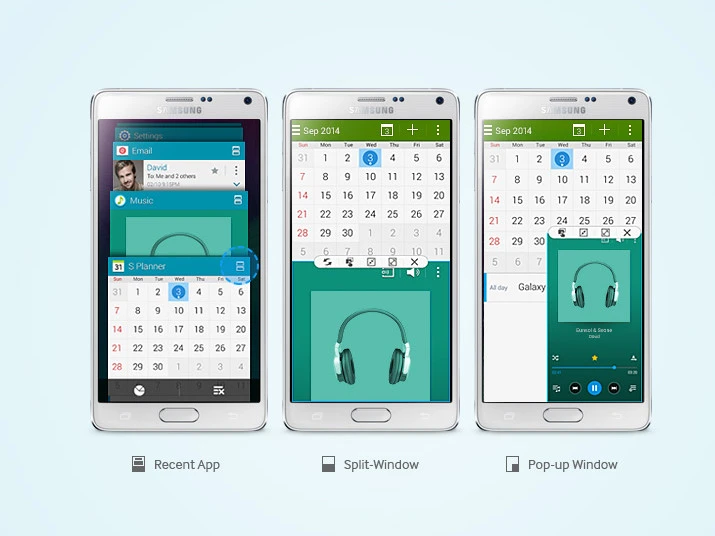 Từ màn hình chính tới tùy chọn đa nhiệm, ứng dụng máy ảnh và cài đặt, Note 4 tỏ ra vượt trội ở tính năng phong phú so với giao diện khá nhàm chán của iPhone 6 Plus. Bên cạnh đó, thiết bị còn có chế độ đa cửa sổ Multi-window và Pop-up View, Photo Note, Smart Select, chế độ dùng 1 tay.