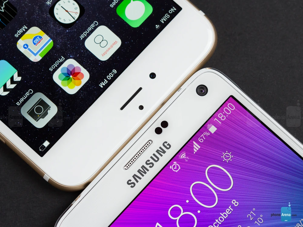 Dù lớn hơn 0.2 inch, Note 4 lại ngắn hơn iPhone 6 Plus, tỉ lệ màn hình trên điện thoại là 74% trong khi iPhone 6 Plus lại có viền trên, dưới rộng hơn, khiến tỉ lệ giảm còn 68%.