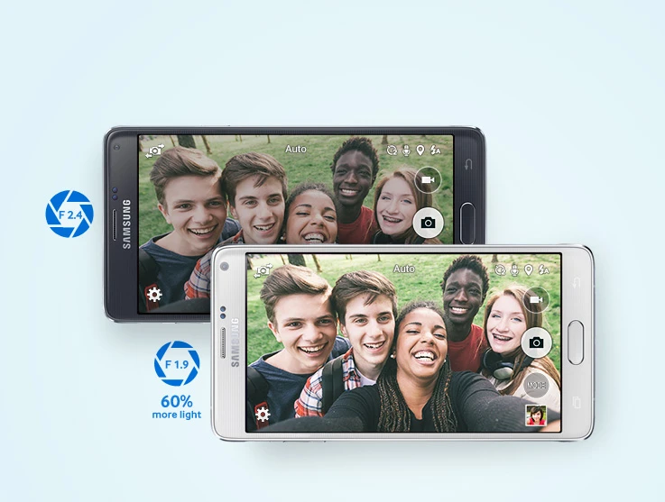 Dù không có độ phân giải cao như HTC Eye, máy ảnh trước trên Note 4 đủ làm hài lòng người dùng vì ống kính 3.7MP siêu rộng độ mở f/1.9, góc chụp 120 độ. Apple đã nâng cấp camera trước trên iPhone 6 Plus lên 1.2MP bằng cảm biến mới, thu nhiều ánh sáng hơn song góc chụp hẹp hơn Note 4.