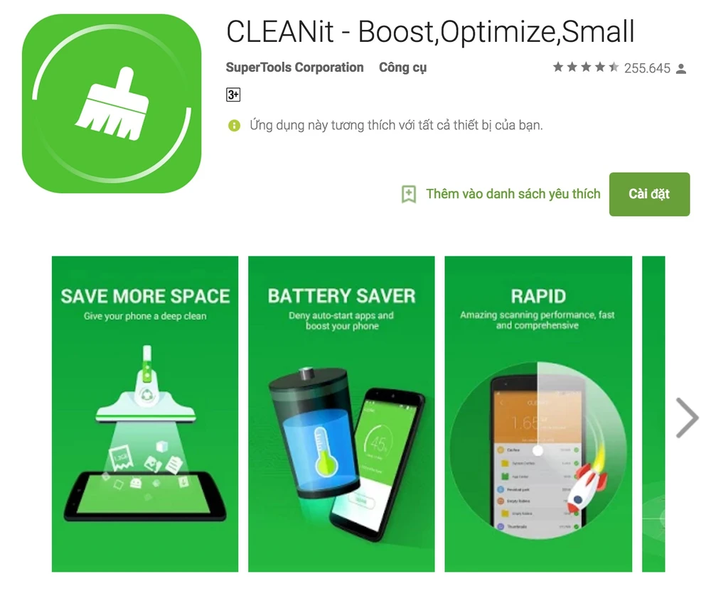 Ứng dụng này đã có hơn 10 triệu lượt cài đặt và 85% đánh giá bốn hoặc năm sao. Tuy nhiên, đa số các ứng dụng làm sạch, dọn dẹp, tăng tốc smartphone đều hoạt động không thật sự hiệu quả, đơn cử như CleanIt, Clean Master… Do đó, nếu muốn tăng tốc Android, bạn chỉ cần vào Settings (cài đặt) > Apps (ứng dụng), lựa chọn các ứng dụng cần xóa dữ liệu và chọn Clear Cache. Việc cài đặt các ứng dụng dọn dẹp hệ thống chỉ gây tốn pin và dữ liệu di động của bạn. Thay vì tăng tốc hệ thống, bạn nên sử dụng Greenify hoặc SD Maid.
