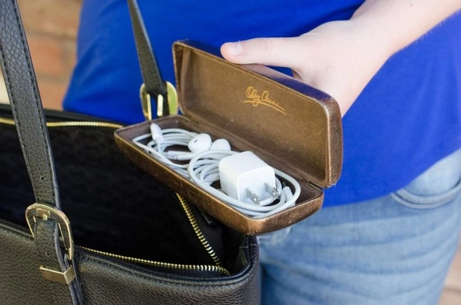 Khi đi du lịch, bạn không thể không mang tai nghe và dây sạc điện thoại. Nhưng bạn sẽ dễ bị thất lạc chúng trong đám hành lý hỗn độn. Một mẹo hay là bạn chỉ cần đựng tai nghe và dây sạc điện thoại trong hộp đựng kính. Bạn cũng có thể tận dụng các hộp kẹo ngọt hoặc hộp kẹo cao su khi dùng xong để giữ tai nghe, vừa tránh được rối dây lại vừa bảo vệ dây không bị các tác động khác khi bỏ vào túi xách.