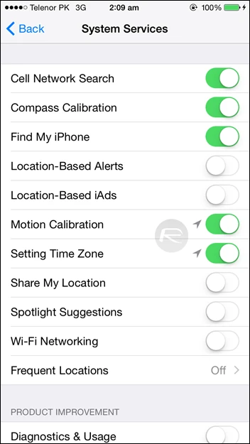 Có một số dịch vụ địa điểm chạy ngầm mà bạn không hề hay biết. Truy cập Settings > Privacy > Location Services > System Services rồi tắt Location-Based Alerts, Location-Based iAds, Spotlight Suggestions, Wi-Fi Networking, Frequent Locations.