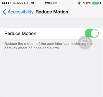 Tính năng Parallax ra mắt cùng iOS 7 và khiến nhiều người chóng mặt, buồn nôn, đồng thời làm hết pin nhanh hơn. Để vô hiệu hóa nó, truy cập Settings > General > Accessibility > Reduce Motion, chuyển sang On.