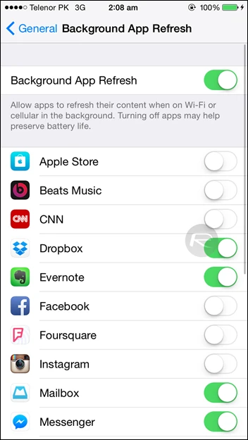 Không phải ứng dụng nào cũng cần cập nhật mọi giây mọi phút, vì thế bạn nên tùy chỉnh xem cái nào cần cái nào không. Truy cập vào Settings > General > Background App Refresh để lựa chọn.