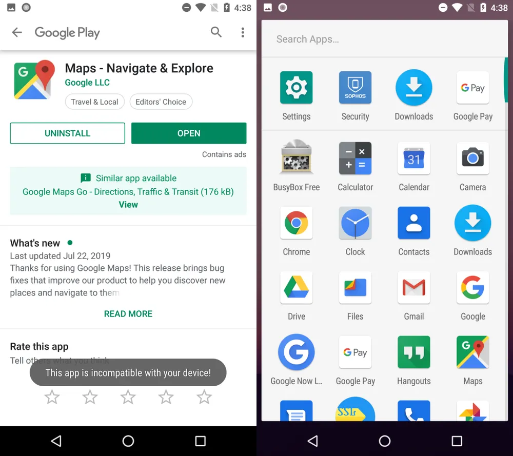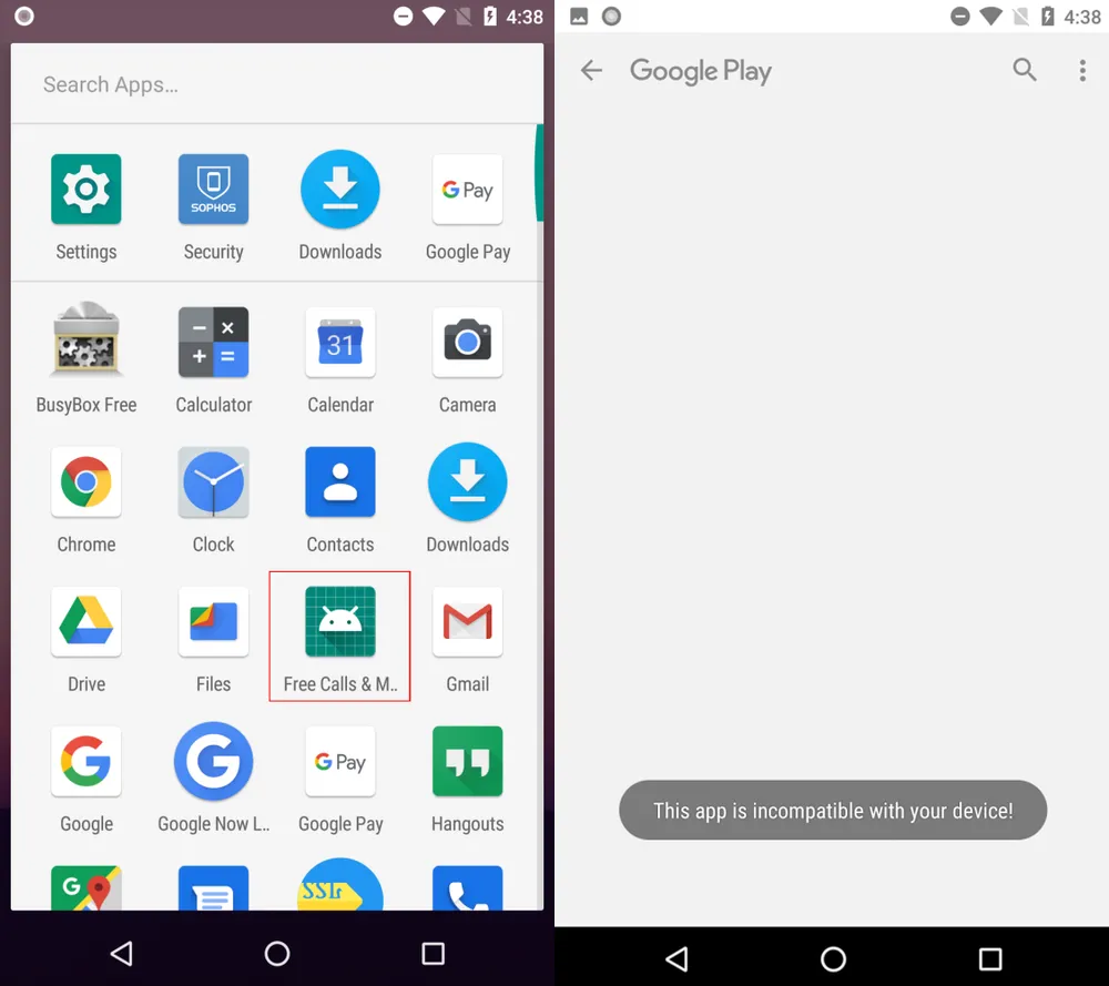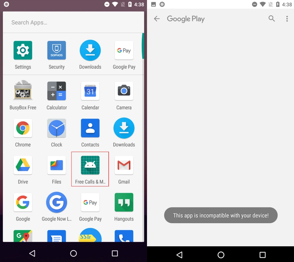 Ban đầu, biểu tượng của ứng dụng độc hại sẽ xuất hiện trên màn hình cùng với tất cả các ứng dụng khác. Tuy nhiên, khi bạn mở ứng dụng, màn hình sẽ hiển thị thông báo “không tương thích” và chuyển sang cửa hàng Google Play.