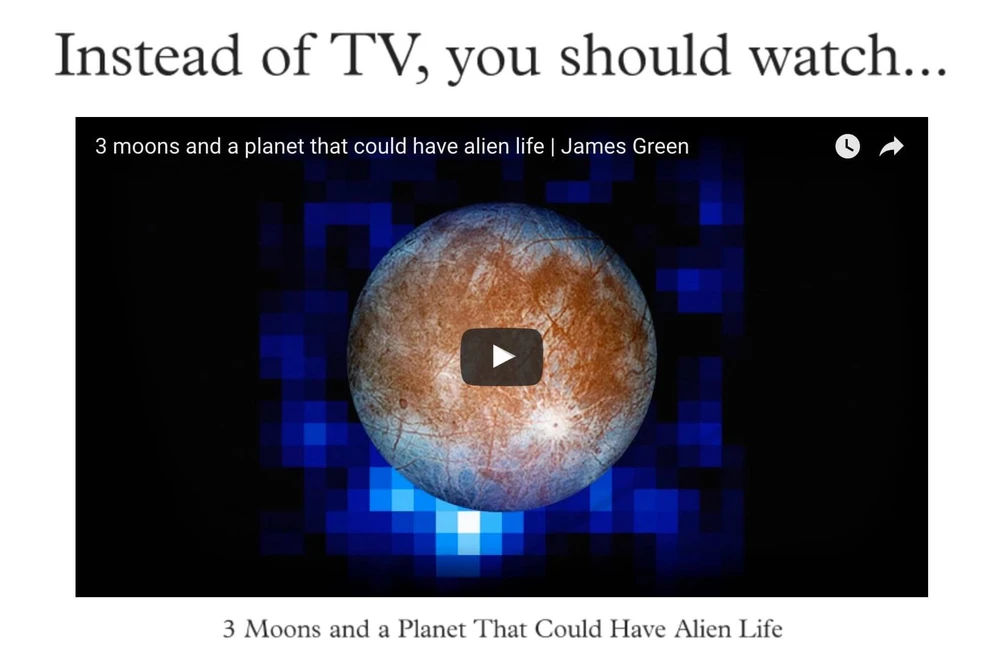 Thay vì lãng phí thời gian cho các bộ phim truyền hình sướt mướt, bạn hãy tắt tivi và truy cập vào địa chỉ http://unplugthetv.com/. Trang web cung cấp rất nhiều video kiến thức, giúp bạn mở mang tầm nhìn và kĩ năng trong cuộc sống.