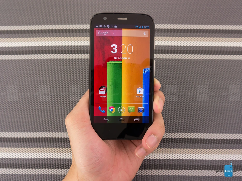 Dù là một sản phẩm tầm trung, Moto G có thông số kỹ thuật không quá thất vọng với màn hình 4.5 inch độ phân giải 720p, kính cường lực Gorilla Glass, vi xử lý Snapdragon 400 1.2GHz, 1GB RAM. Bên trong máy được phủ lớp nano chống nước.