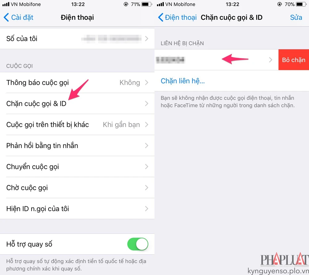 - Bước 3: Ngược lại, nếu muốn bỏ chặn, người dùng chỉ cần vào Settings (cài đặt) > Phone (điện thoại) > Call Blocking & Identification (chặn cuộc gọi & ID), sau đó vuốt từ phải sang trái và chọn Unblock (bỏ chặn).
