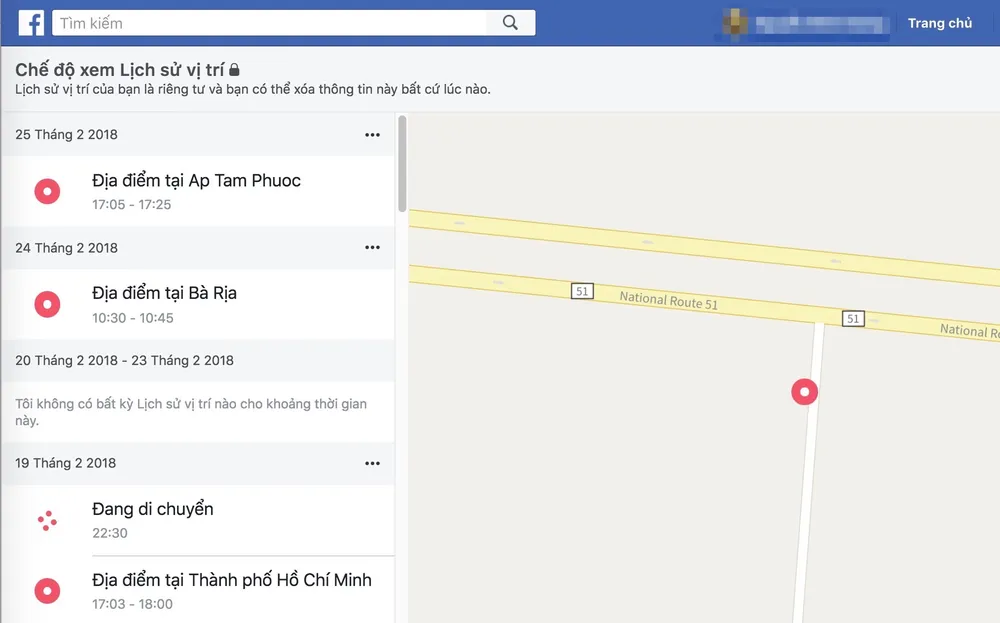 Ứng dụng Facebook trên smartphone sẽ liên tục theo dõi vị trí của người dùng theo thời gian thực. Chỉ cần truy cập vào https://www.facebook.com/location_history/view/, bạn có thể thấy danh sách tất cả các địa điểm bạn đã đến (kèm theo thời gian) được hiển thị đầy đủ trên bản đồ. Điều này cho thấy nhất cử nhất động của người dùng hiện nay đều có thể bị theo dõi đến từng chi tiết.