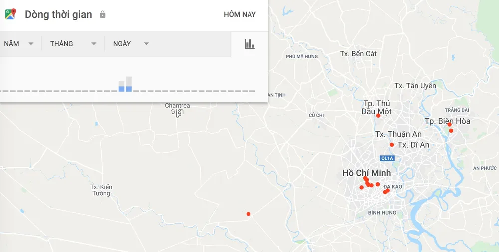 Mặc định, Google sẽ lưu lại tất cả địa điểm mà bạn đã từng đến và đi cùng các mốc thời gian tương ứng. Nếu muốn xem lại, bạn chỉ cần truy cập vào địa chỉ https://www.google.com/maps/timeline, lựa chọn ngày, tháng, năm cần xem và chờ một lát để dữ liệu được tải hoàn tất.