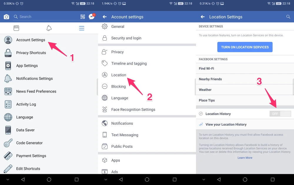 Nếu cảm thấy lo ngại về các vấn đề riêng tư, bạn có thể tắt hoàn toàn tính năng chia sẻ vị trí trên smartphone bằng cách mở Facebook, vào Settings & Privacy (cài đặt & riêng tư) > Account settings (cài đặt tài khoản) > Location (vị trí) và tắt tùy chọn Location history (lịch sử vị trí). Thực hiện tương tự trên máy tính.
