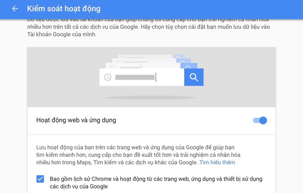 Tại đây gồm có các tùy chọn Hoạt động web và ứng dụng, Lịch sử vị trí (chính là những địa điểm mà bạn đã đến), Thông tin thiết bị, Hoạt động bằng giọng nói và âm thanh, Lịch sử tìm kiếm và các video đã xem trên YouTube… Nếu muốn bảo mật thông tin cá nhân, bạn có thể tắt bớt các tùy chọn không cần thiết bằng cách kích vào nút gạt màu xanh ở ngay bên cạnh.