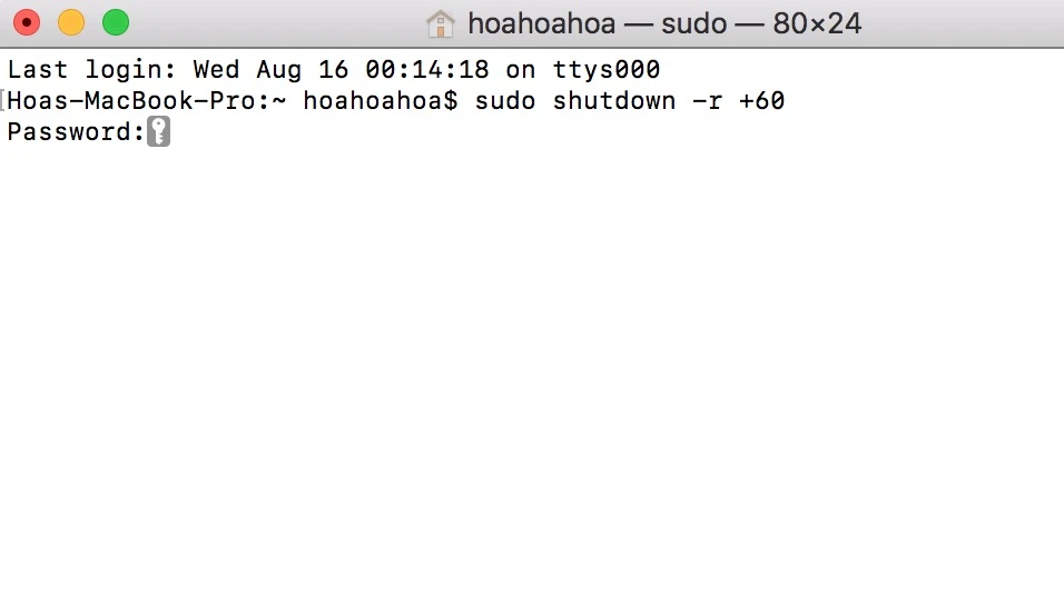 - Khởi động lại máy tính sau khoảng thời gian định sẵn: Ví dụ, lệnh sudo shutdown -r +60 sẽ giúp bạn khởi động lại máy tính sau 60 giây, nhập mật khẩu khi được yêu cầu.