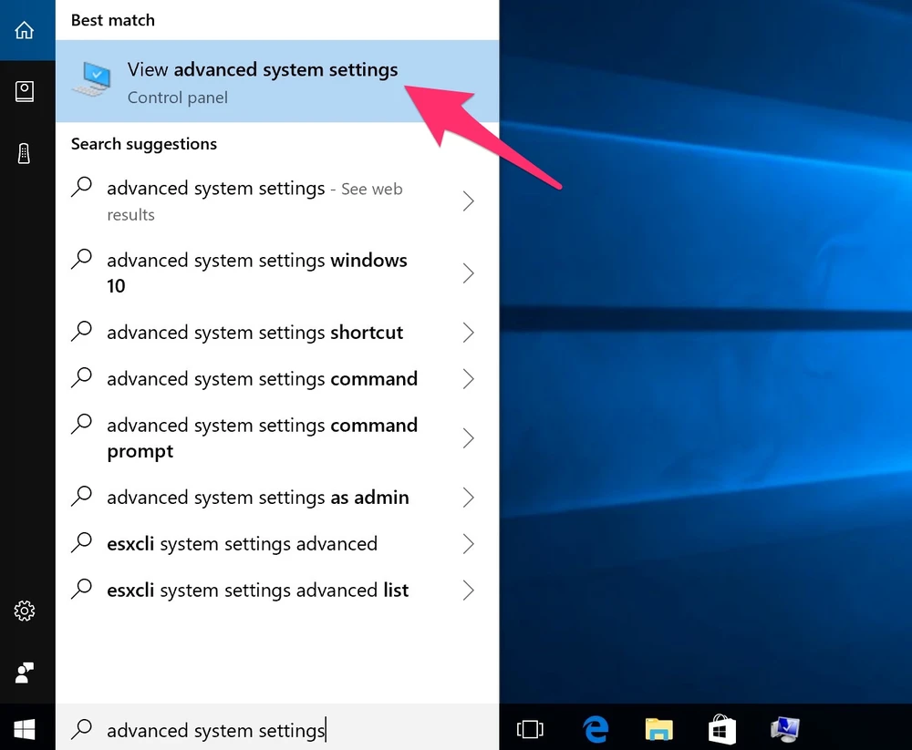 Nếu đang sử dụng một giải pháp sao lưu khác như Shadow Defender, Ghost... người dùng có thể vô hiệu hóa tính năng System Restore để tiết kiệm dung lượng ổ cứng. Đầu tiên, bạn hãy gõ từ khóa advanced system settings vào khung tìm kiếm.
