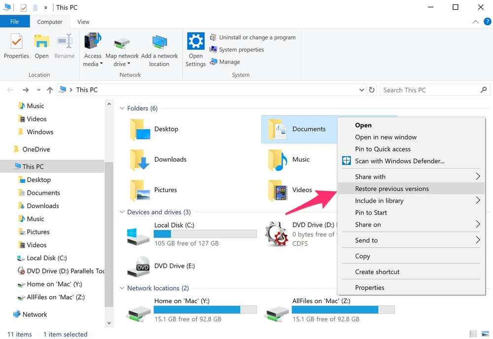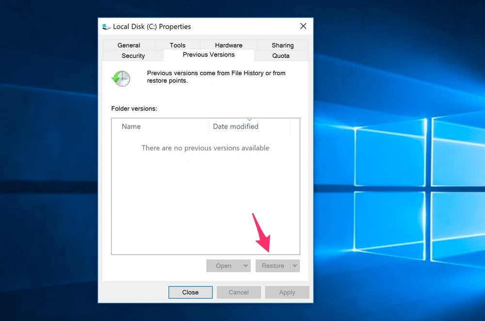 Lưu ý, nếu không thấy xuất hiện tùy chọn Restore previous versions, bạn hãy nhấp phải chuột vào My Computer (hoặc This PC) và chọn Properties. Chuyển sang thẻ Previous Versions (hoặc System protection), chọn bản sao lưu tương ứng và làm theo các bước hướng dẫn cho đến khi hoàn tất. Tên và vị trí các tùy chọn có thể thay đổi đôi chút tùy vào phiên bản Windows bạn đang sử dụng.