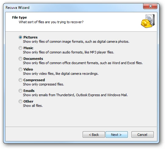 Giao diện của chương trình tương đối đơn giản, việc bạn cần làm là lựa chọn loại tập tin cần khôi phục (hình ảnh, video, tài liệu...). Tiếp theo, người dùng cần lựa chọn ổ đĩa hoặc thư mục chứa dữ liệu đã xóa nhầm trước đó, chờ một lát cho đến khi Recuva quét hoàn tất.