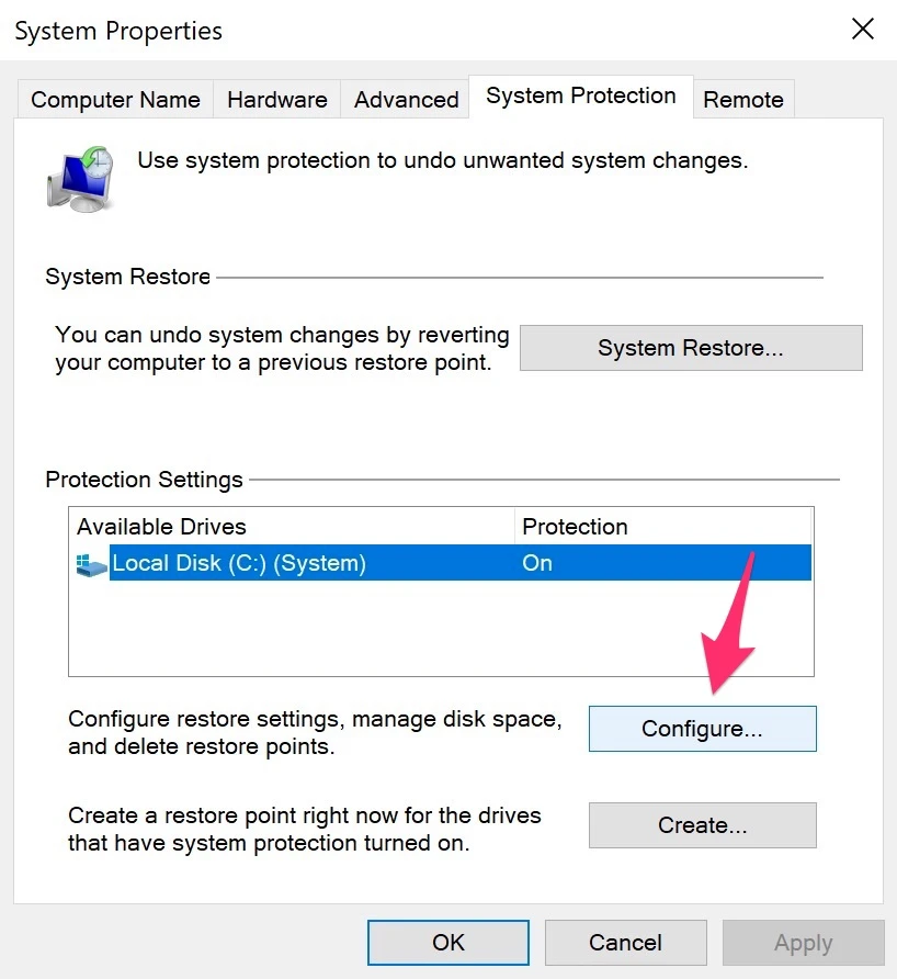 Tiếp theo, bạn hãy chuyển sang thẻ System Protection, chọn ổ đĩa đang kích hoạt tính năng tự động sao lưu (Protection: On) rồi nhấn Configure.