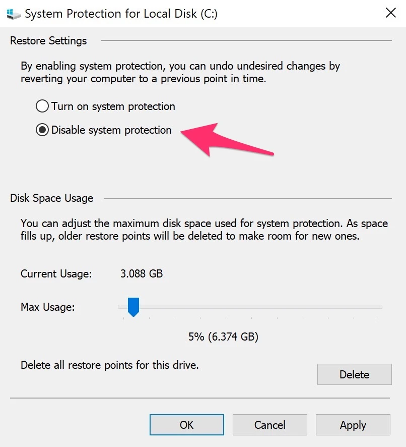 Cuối cùng, người dùng chỉ cần chọn Disable system protection rồi nhấn OK, toàn bộ những tập tin sao lưu trước đó sẽ bị xóa bỏ khỏi ổ cứng, giúp lấy lại dung lượng trống mà không cần gỡ bỏ những phần mềm yêu thích.
