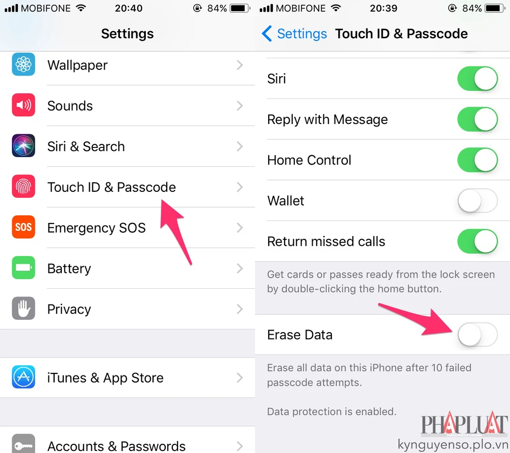Lưu ý, nếu tính năng Erase Data (xóa dữ liệu) trong phần Settings (cài đặt) > Touch ID & Passcode (Touch ID & mật mã) đã được kích hoạt, toàn bộ dữ liệu sẽ bị xóa khi bạn nhập sai mật khẩu quá mười lần.