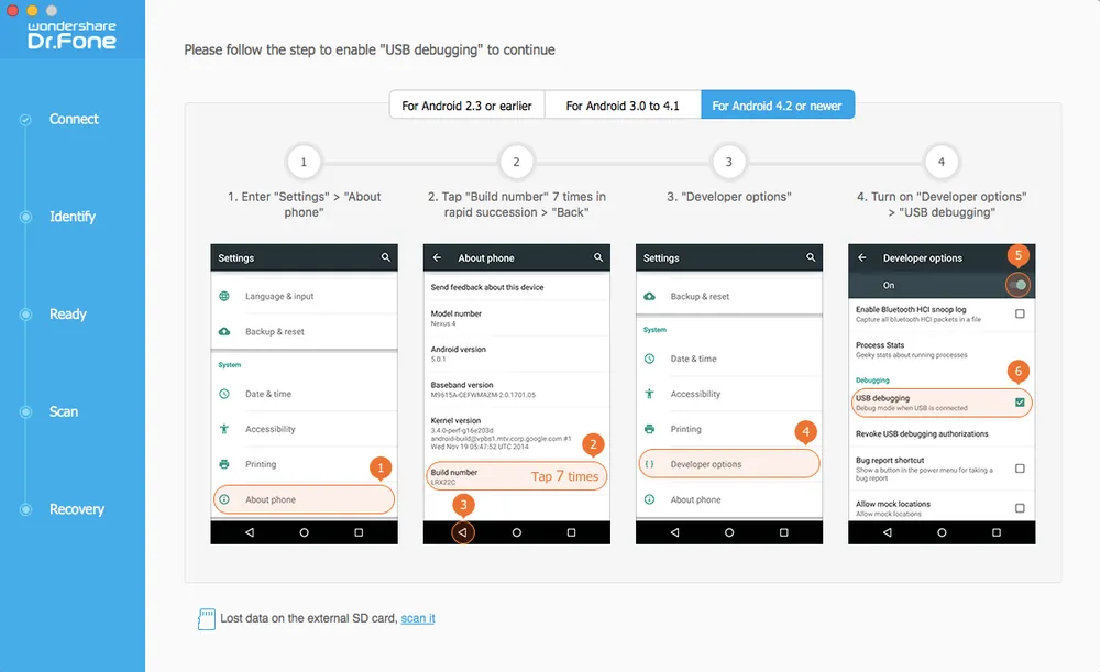 - Bước 2: Tiếp theo, bạn hãy nhấn vào mục For Android 4.2 or newer (dành cho Android 4.2 hoặc mới hơn), sau đó làm theo bốn bước hướng dẫn như trên màn hình để kích hoạt tùy chọn USB Debugging trên điện thoại. Chờ một lát để quá trình xác thực thông tin và kết nối hoàn tất.