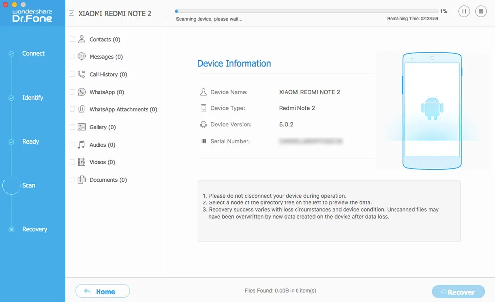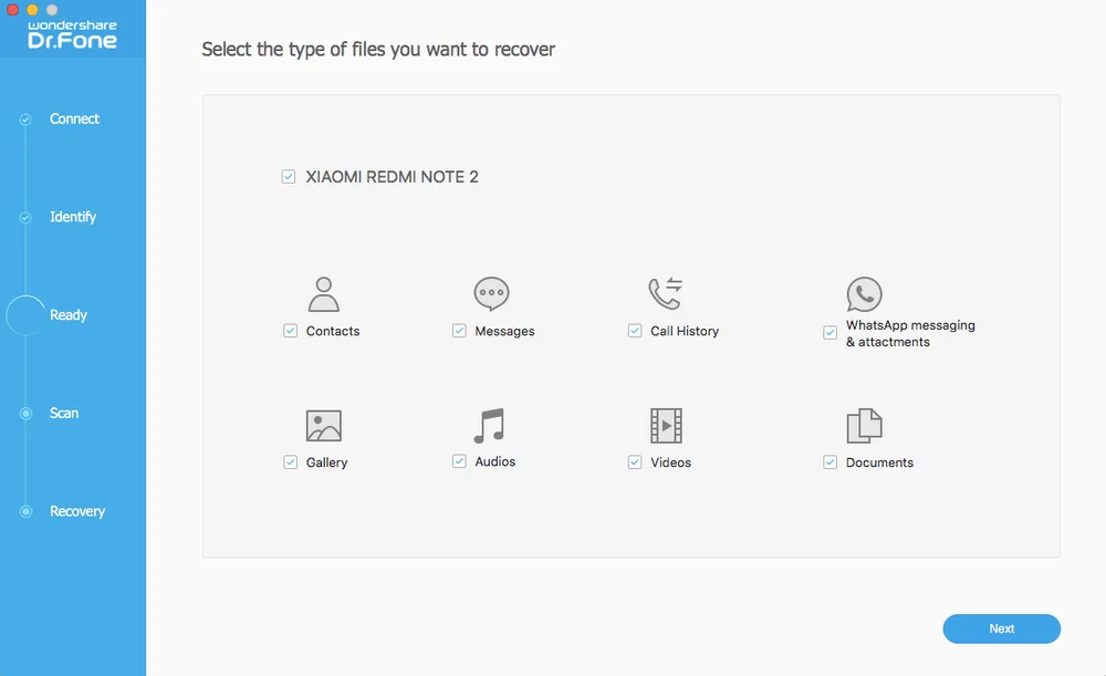 - Bước 3: Bây giờ, người dùng chỉ cần đánh dấu chọn vào các định dạng tập tin cần khôi phục như Contacts (danh bạ), Messages (tin nhắn), Call History(lịch sử cuộc gọi),Gallery (hình ảnh), Audios (âm thanh)… rồi bấm Next và chờ một lát để ứng dụng quét toàn bộ thiết bị.