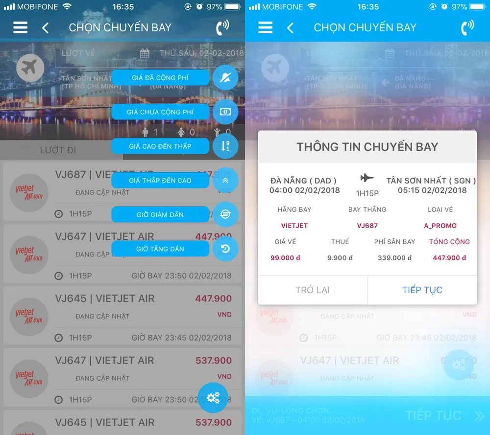 VietJet thường là hãng có mức giá khá rẻ, tuy nhiên bù lại thời gian delay (chậm trễ) cũng khá cao. Khi chạm vào một chuyến bay bất kỳ, bạn có thể xem được thông tin chi tiết về chuyến bay, hãng bay, bay thẳng hoặc quá cảnh, loại vé, giá vé, thuế, phí sân bay và tổng cộng tiền cần phải thanh toán.