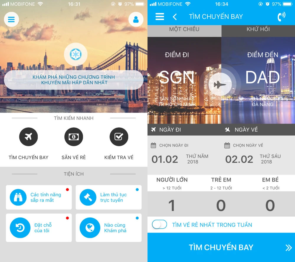 Giao diện của ứng dụng khá đơn giản với các mục chính như tìm chuyến bay, săn vé rẻ và kiểm tra thông tin vé. Để có được chiếc vé phù hợp, bạn hãy nhấp vào mục tìm chuyến bay, lựa chọn loại vé dạng một chiều hoặc khứ hồi, chạm vào điểm đi và điểm đến để thay đổi thông tin tùy ý, sau đó thiết lập ngày đi, ngày về cùng số lượng người rồi nhấn tìm chuyến bay.