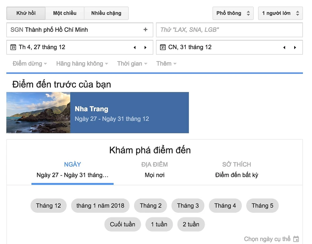 - Bước 1: Đầu tiên, bạn hãy truy cập Google Flights thông qua địa chỉ https://www.google.com/flights/, lựa chọn kiểu vé khứ hồi, một chiều hoặc nhiều chặng. Tại đây sẽ có bốn loại vé khác nhau gồm phổ thông, phổ thông cao cấp, hạng thương gia và hạng nhất.