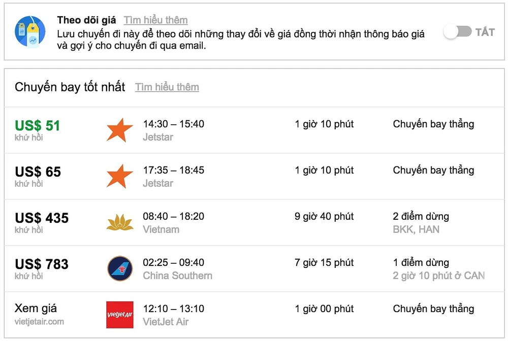 - Bước 3: Ngoài ra, người dùng còn có thể chọn điểm dừng, hãng hàng không, giá vé, thời gian bay và các sân bay chuyển tiếp (nếu muốn). Lúc này, Google Flights sẽ hiển thị toàn bộ chuyến bay tương ứng với đủ mọi mức giá. Lưu ý, nếu không muốn bỏ lỡ các đợt giảm giá, bạn hãy kích hoạt tính năng theo dõi giá để nhận thông báo qua email.