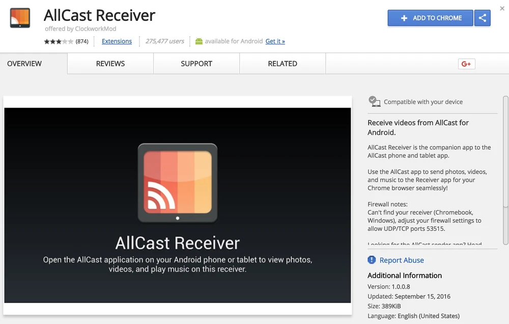 - Bước 1: Đầu tiên, bạn cần phải cài đặt ứng dụng Screen Recording and Mirror cho smartphone tại địa chỉ https://goo.gl/P0AJph. Sau đó, cài tiếp tiện ích Allcast Receiver cho trình duyệt Chrome trên máy tính tại https://goo.gl/l6d3L2, nhấn Add to chrome > Add extension.