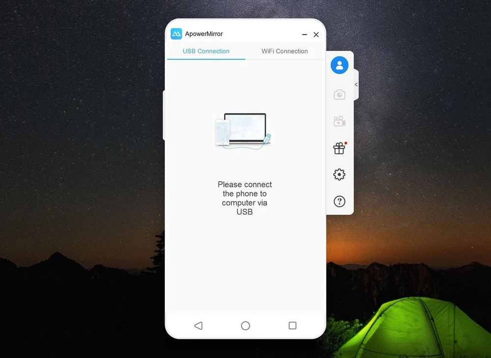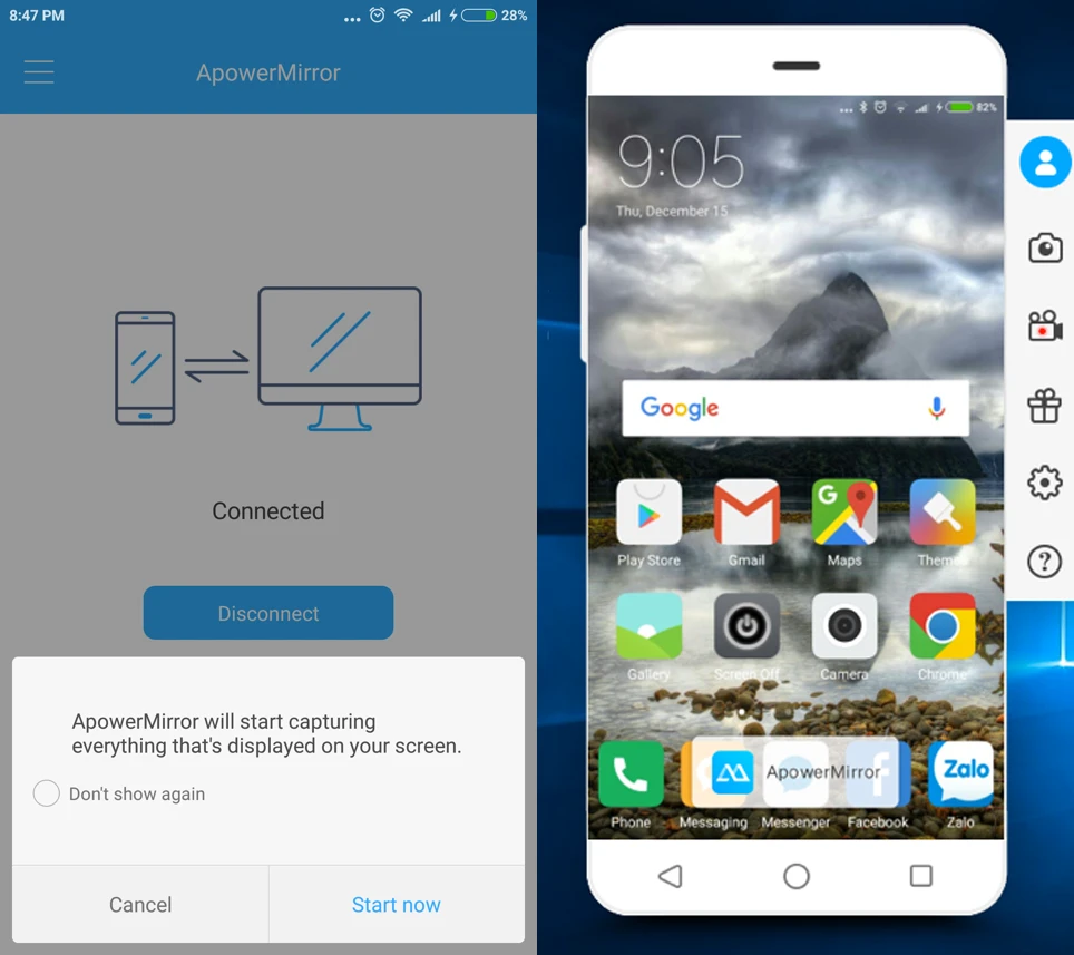 Thanh menu nằm bên phải cho phép bạn chụp nhanh màn hình, quay phim màn hình… Ngoài ra, khi mở ứng dụng trên điện thoại ở chế độ nằm ngang, cửa sổ ApowerMirror trên PC cũng sẽ xoay theo. Điều này giúp bạn có một màn hình làm việc lớn hơn, thích hợp cho việc chơi game hay xem video hoặc đơn giản chỉ để điều khiển điện thoại Android không cần phải tạm dừng công việc trên máy tính.