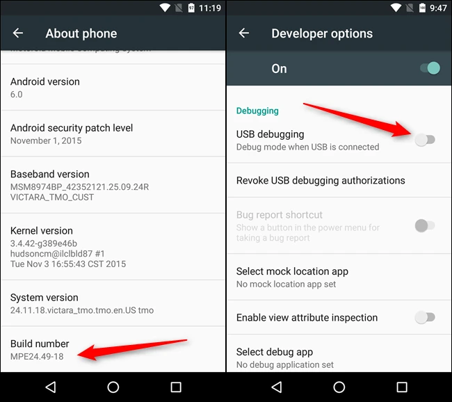 Quay ngược lại phần Settings (cài đặt) > Developer Options (tùy chọn nhà phát triển) > USB Debugging (gỡ lỗi USB).