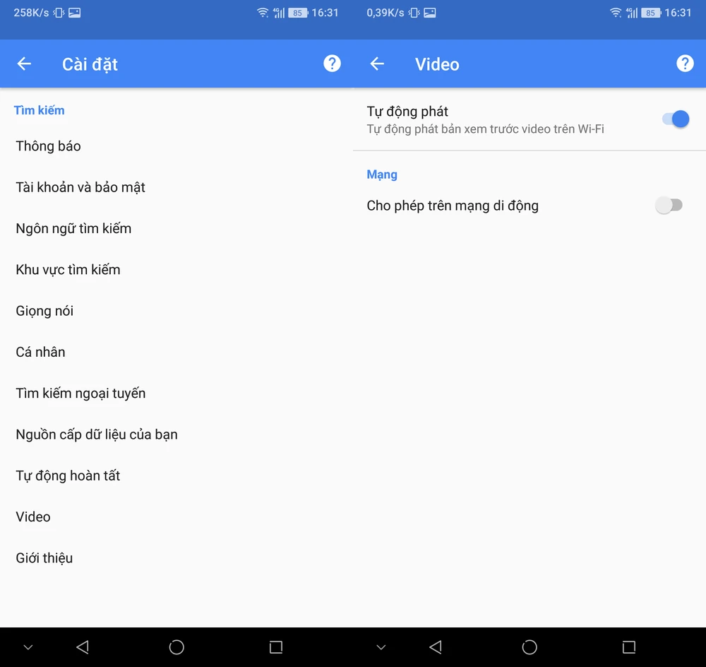 Tiếp theo bạn tìm đến mục Video, vô hiệu hóa tùy chọn Autoplay (tự động phát) và Allow on mobile networks (cho phép trên mạng di động).