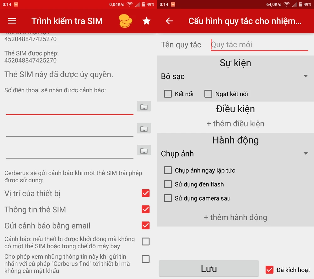 Bên cạnh đó, ứng dụng còn tự động gửi vị trí, thông tin thẻ SIM qua tin nhắn/email khi kẻ trộm thay đổi SIM trên smartphone. Một trong những tính năng khiến Cerberus nổi trội hơn các ứng dụng khác là khả năng tự kích hoạt lệnh khi điều kiện xảy ra, đơn cử như nếu kẻ trộm tắt thông báo, rút sạc hoặc ngắt kết nối thì tự động Cerberus sẽ chụp lại hình ảnh. Tương tự, người dùng có thể tự thiết lập thêm nhiều quy tắc khác trong phần AutoTask configuration.
