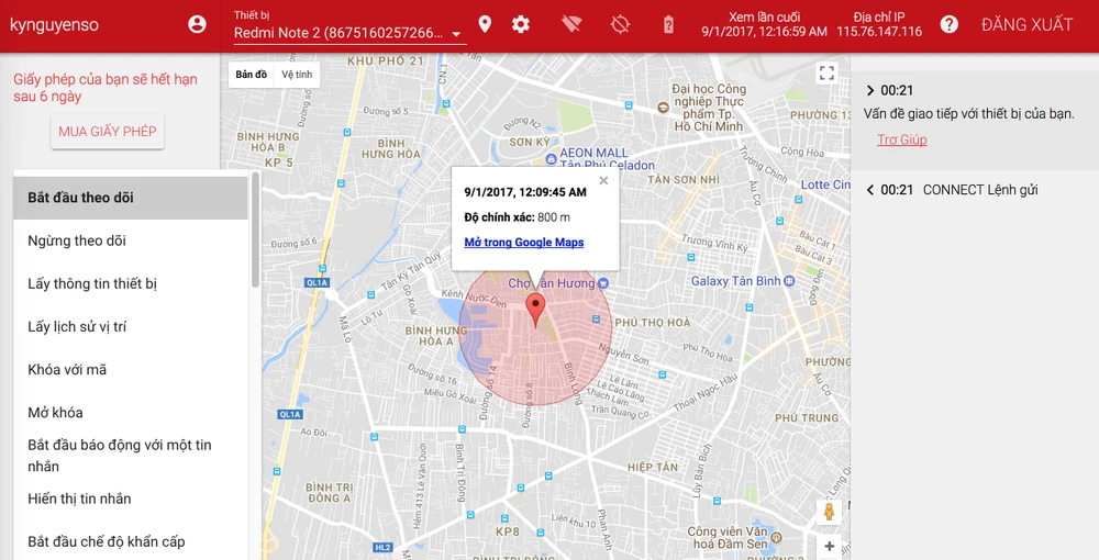 Nếu chẳng may smartphone đã bị mất, bạn hãy mở trình duyệt trên máy tính hoặc một thiết bị khác và truy cập địa chỉ http://www.cerberusapp.com/, đăng nhập cùng một tài khoản như trên điện thoại. Tiếp theo, bạn hãy chọn lệnh Start tracking (bắt đầu theo dõi) > Send Command (gửi lệnh), khi có thay đổi xảy ra, ngay lập tức ứng dụng sẽ hiển thị cảnh báo ở khung nhỏ bên phải hoặc gửi đến email bạn dùng đăng ký lúc đầu.