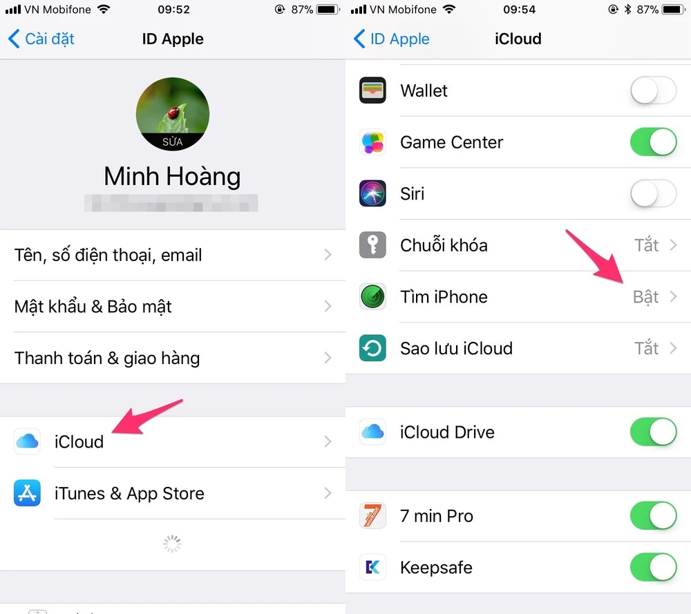 Trước khi thực hiện, hãy chắc chắn rằng tính năng Find My iPhone đã được kích hoạt trong phần Settings (cài đặt) > Apple ID, iCloud, iTunes & App Store như hình bên dưới. Tiếp theo, bạn hãy tìm đến mục iCloud > Find My iPhone (tìm iPhone) > Find My iPhone (tìm iPhone). Ngoài ra, người dùng cũng nên kích hoạt thêm tùy chọn Send Last Location để gửi thông tin vị trí sau cùng đến Apple khi thiết bị sắp hết pin.
