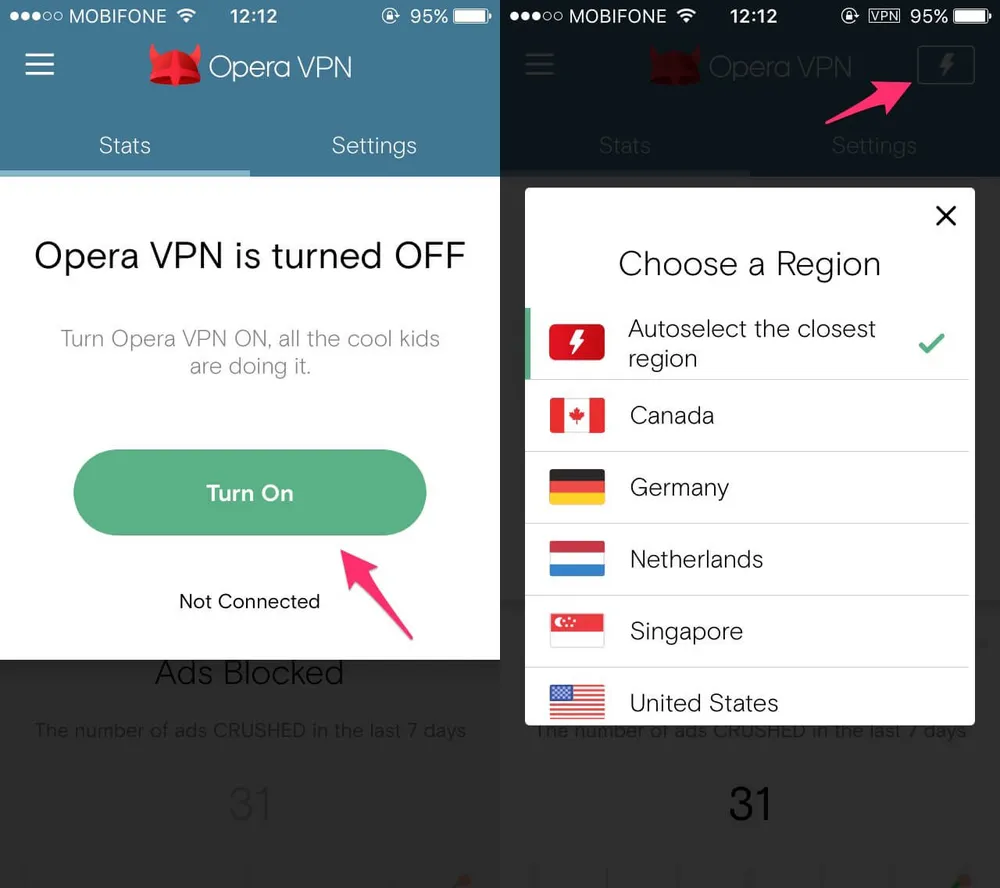 Đối với các thiết bị Android và iOS, bạn chỉ cần cài đặt ứng dụng Opera VPN tại địa chỉ https://www.operavpn.com/. Tương tự như trên, khi hoàn tất bạn chỉ cần nhấn Turn On để kích hoạt chế độ VPN (Virtual private network - mạng riêng ảo). Chế độ này sẽ giúp mã hóa kết nối và dữ liệu được truyền tải giữa thiết bị người dùng và máy chủ.