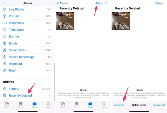 Tuy nhiên, nếu đã có ý định xóa vĩnh viễn, bạn hãy chuyển sang mục Album - Recently Deleted (đã xóa gần đây) - Select (chọn) - Delete all (xóa tất cả).