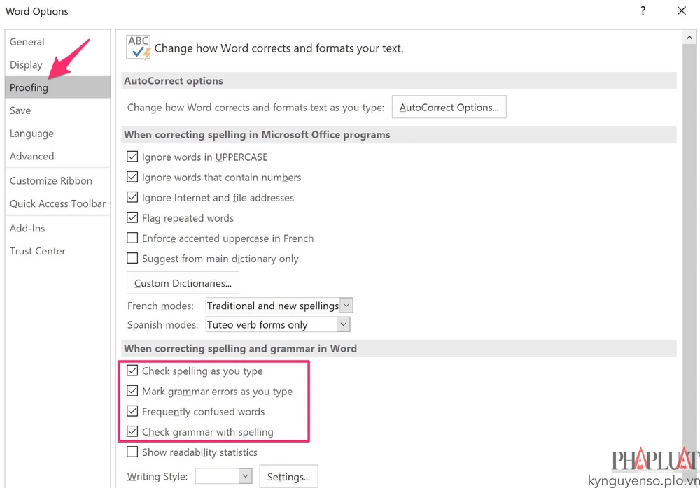 - Bước 2: Khi cài đặt thành công, trên menu của Microsoft Word sẽ xuất hiện thêm mục Chính Tả. Lưu ý, người dùng cần phải vô hiệu hóa tính năng kiểm tra chính tả (tiếng Anh) trên Word trước khi sử dụng bằng cách bấm vào menu File > Options > Proofing và vô hiệu hóa các tùy chọn Check spelling as you type, Mark grammar error as you type, Frequently confused words và Check grammar with spelling như hình bên dưới.