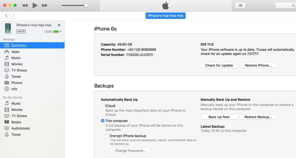 Đầu tiên, bạn hãy kết nối iPhone, iPad với máy tính, sau đó mở ứng dụng iTunes và tiến hành sao lưu lại toàn bộ dữ liệu để hạn chế tối đa các rủi ro có thể xảy ra.