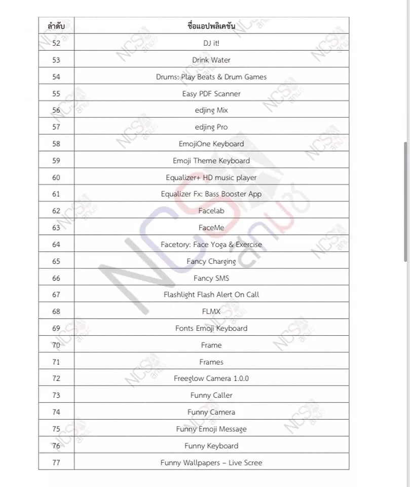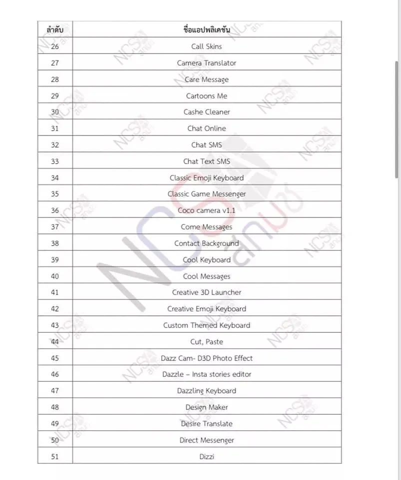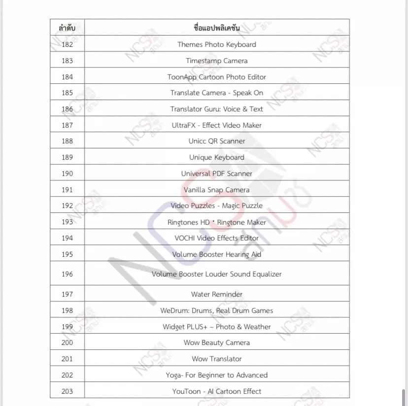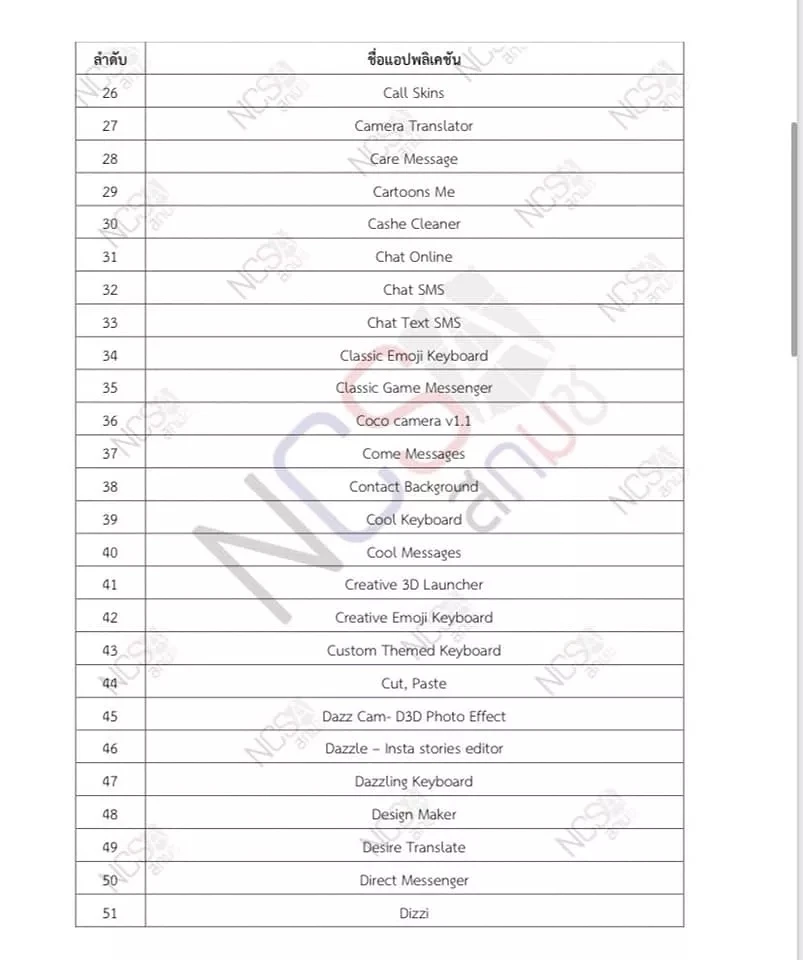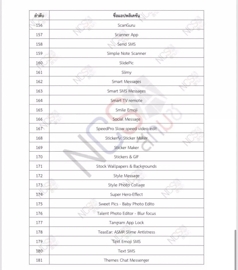 Bộ trưởng DES - Chaiwut Thanakamanusorn nói rằng người dùng điện thoại Android và iOS nên đảm bảo không cài đặt bất kỳ ứng dụng nào bị nhiễm phần mềm độc hại trong danh sách bên dưới. Đồng thời cập nhật thiết bị lên phiên bản mới nhất để tránh bị tin tặc khai thác dữ liệu, và đánh cắp tiền trong tài khoản ngân hàng.