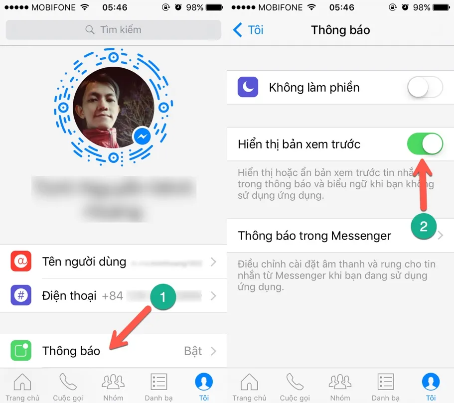 - Bước 2: Tiếp theo, kéo xuống bên dưới và vô hiệu hóa tùy chọn Show Preview (xem trước). Đối với Facebook Messenger, bạn chỉ cần mở ứng dụng, chuyển sang thẻ Me (tôi) > Notifications (thông báo) và tắt tùy chọn Show Preview (hiển thị bản xem trước).